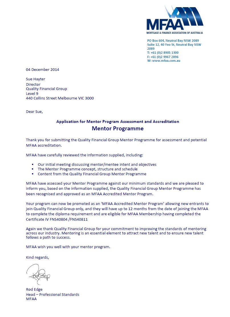 2014 Quality Financial Group Mentoring Programme approved by the Mortgage & Finance Association of Australia (MFAA)
